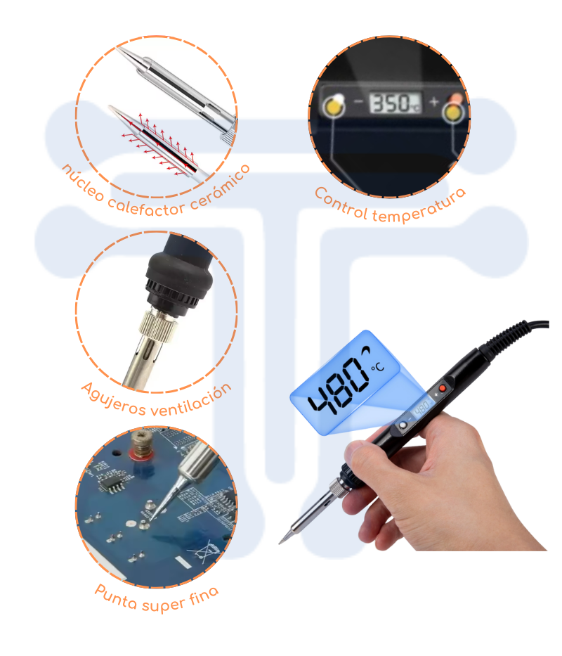Este cautín de diseño compacto es ideal para uso profesional.La temperatura se puede ajustar desde el botón desde 180°C – 500°C.