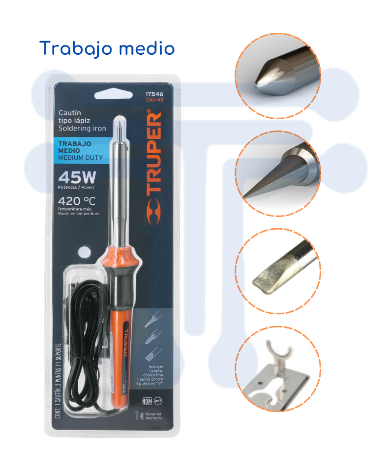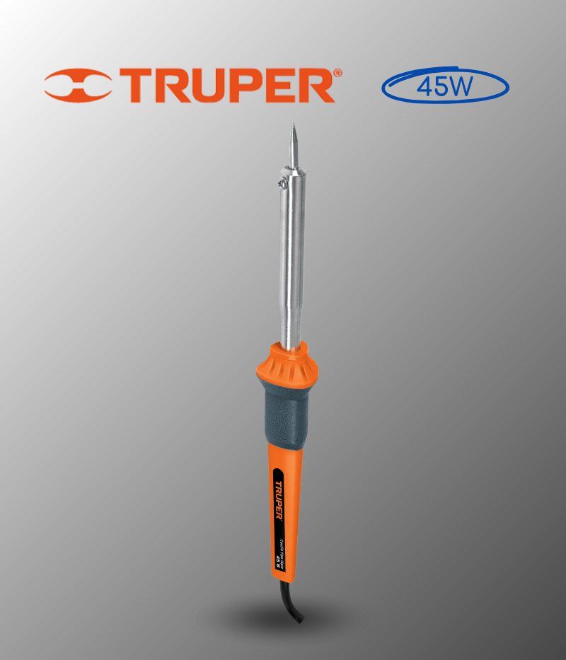 Cautín Truper de 45W con punta de cobre con recubrimiento de níquel, mango de nylon ideal para trabajo medio