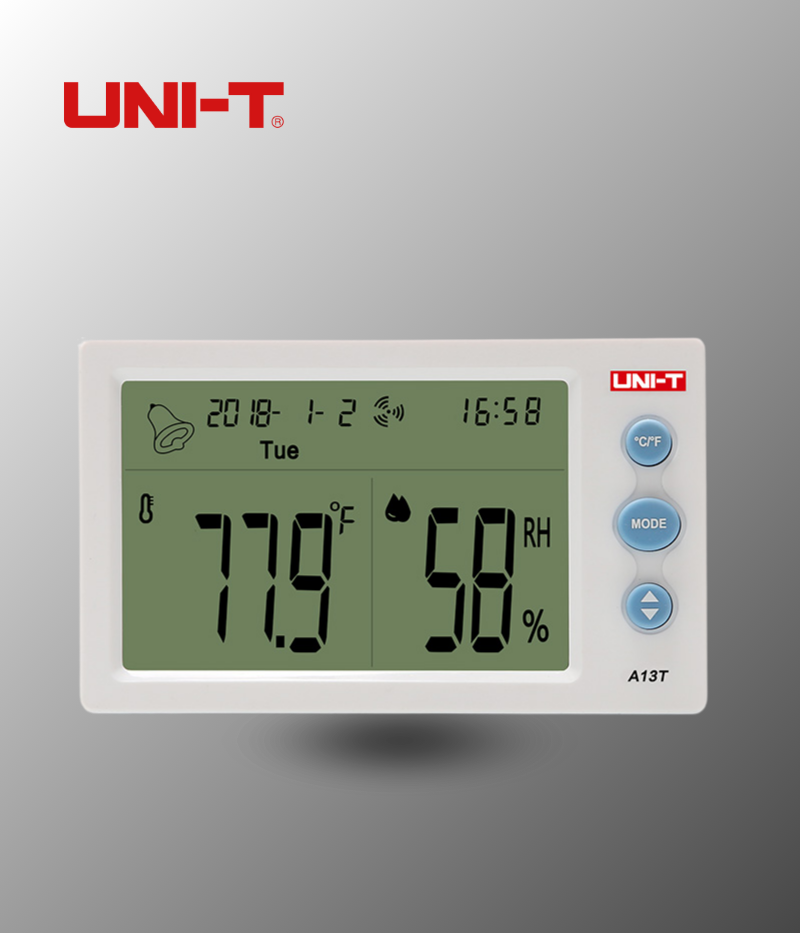 El A13T mide la temperatura y la humedad en tiempo real y muestra las lecturas en una pantalla grande. Se puede usar tanto para mediciones en interiores como en exteriores.