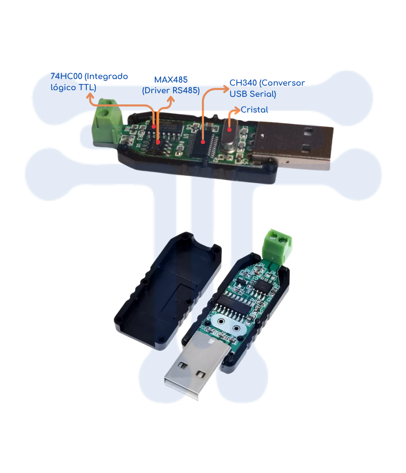 El Conversor USB a RS485 permite establecer comunicación bidireccional entre una PC (USB) y un microcontrolador/variador de frecuencia utilizando el protocolo RS485.