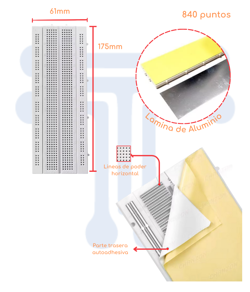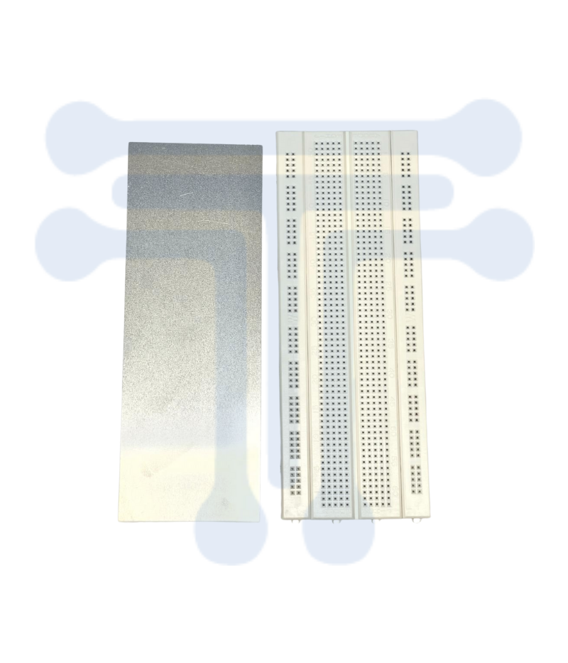 Placa de prueba con 840 puntos, diseñada para armar circuitos electrónicos sin necesidad de soldadura.
