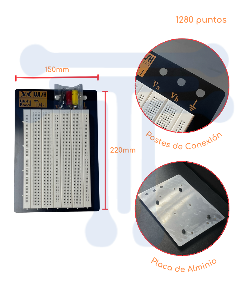 Placa de prueba con 1280 puntos, diseñada para armar circuitos electrónicos sin necesidad de soldadura.