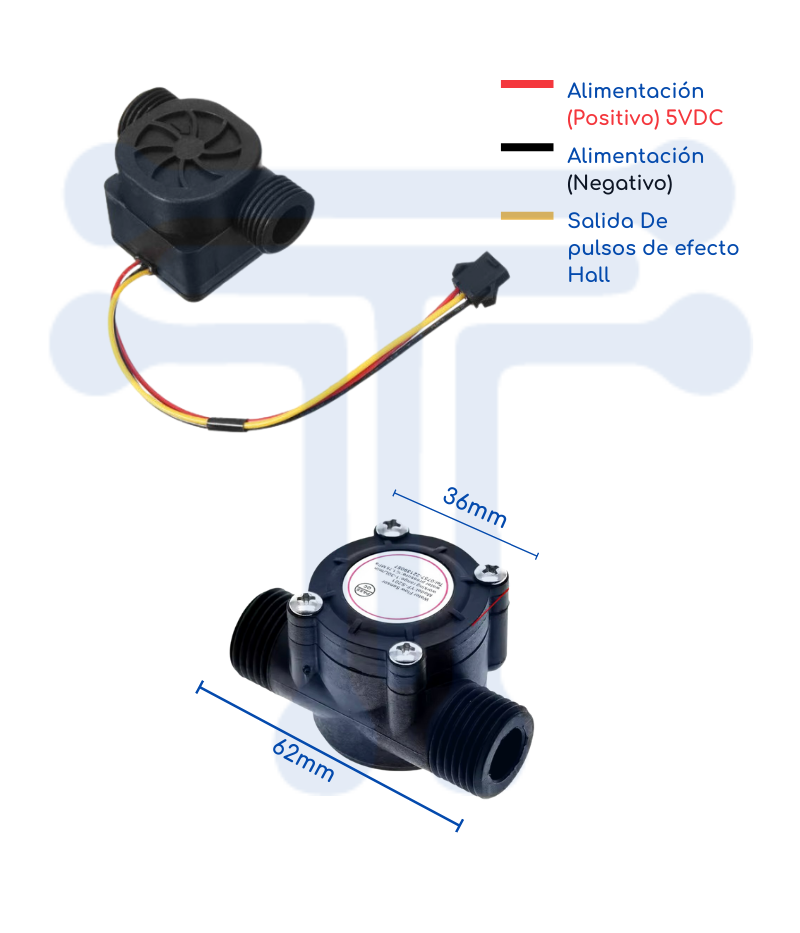 El sensor posee tres cables: rojo (VCC: 5VDC), negro (tierra) y amarillo (salida de pulsos del sensor de efecto Hall). Con la ayuda de este sensor podrás ingresar al mundo de la Domótica, monitoreando el consumo de agua en tu hogar, o puedes hacer un dispensador de volumen automatizado con la ayuda de una válvula adicional.